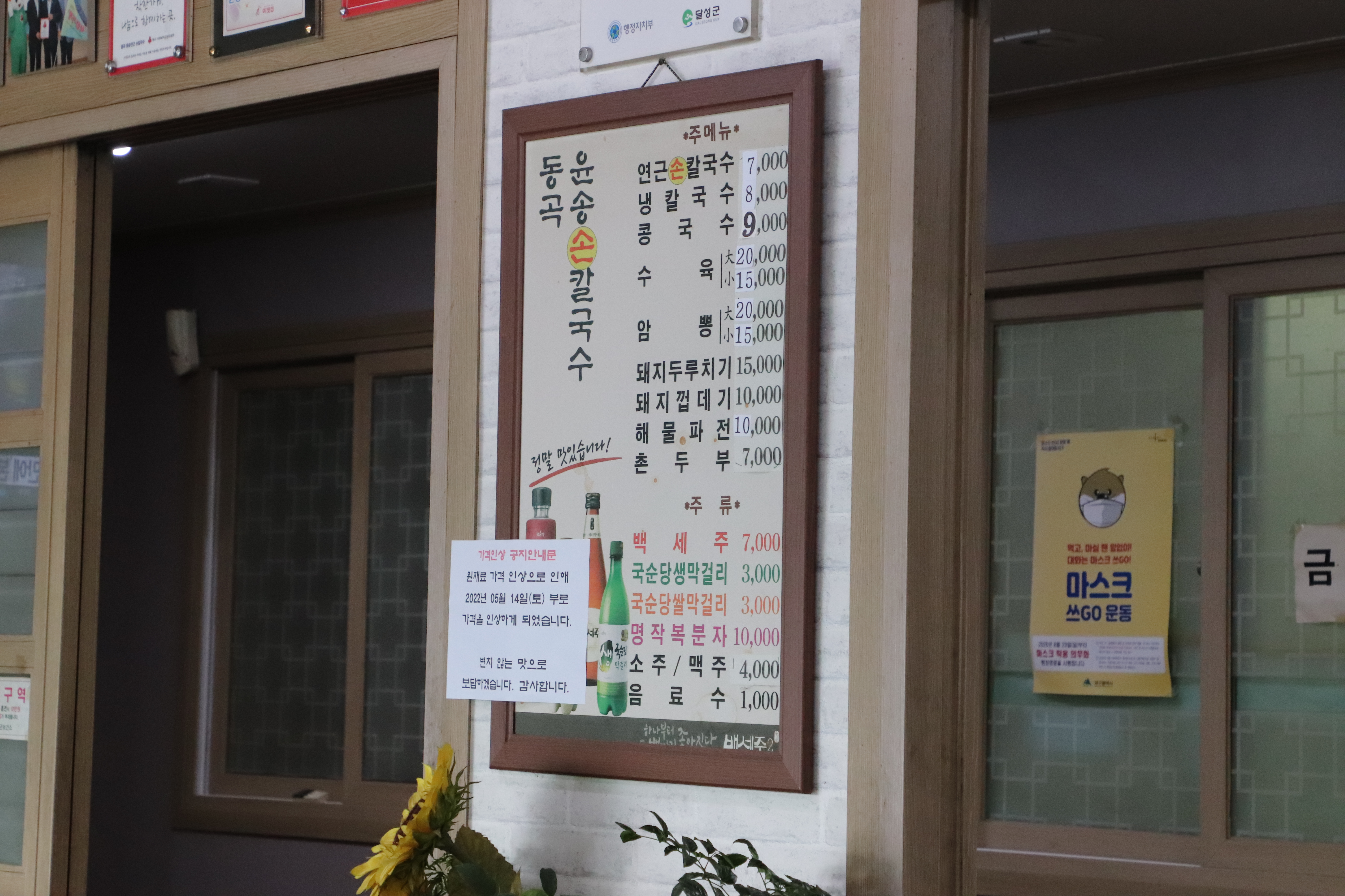 식당 내부는 화려할 것 없이 시 외곽에서 만날 수 있는 푸근한 느낌이었어요. 메뉴판을 보니 가격 인상과 더불어 부분 수정한 흔적이 역력 합니다. 종이에는 메뉴 가격 인상에 대한 양해의 말까지 붙여두셨어요.
