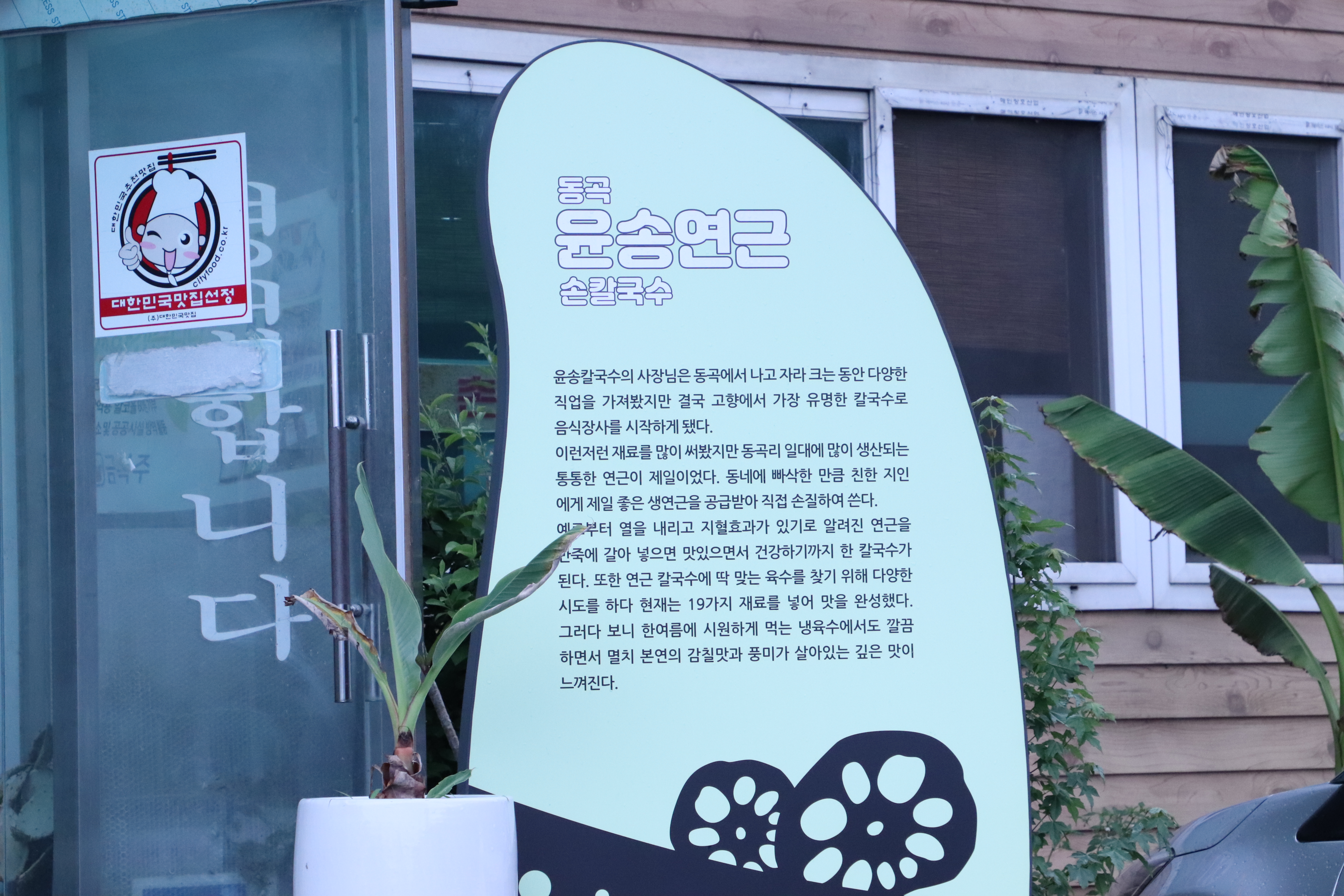 식당 앞에 소개가 짠~ 되어 있어요. 동곡윤송 연근손칼국수 식당을 운영하는 사장님은 동곡에서 나고 자란 분이었어요. 다른 일을 하시다 결국 고향인 동곡에서 칼국수 장사를 시작하셨다고.