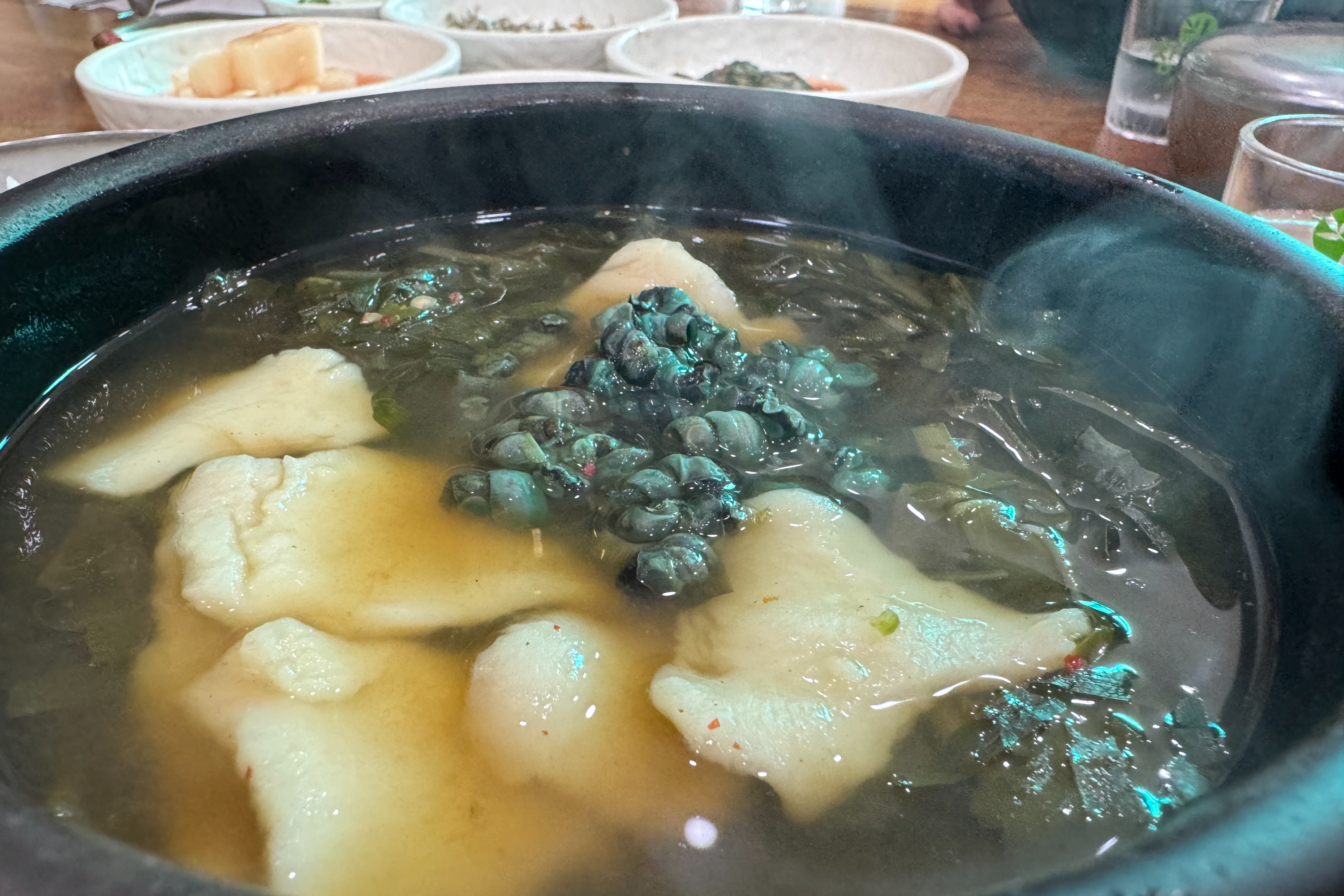 다슬기의 쫄깃한 식감을 느끼는 것도 좋았는데 쫀득한 수제비까지 들어 있으니 국밥 먹는 재미가 더해집니다. 잡내가 전혀 없어서 각 식재료의 조화가 잘 어우러지는 올뱅이국밥.