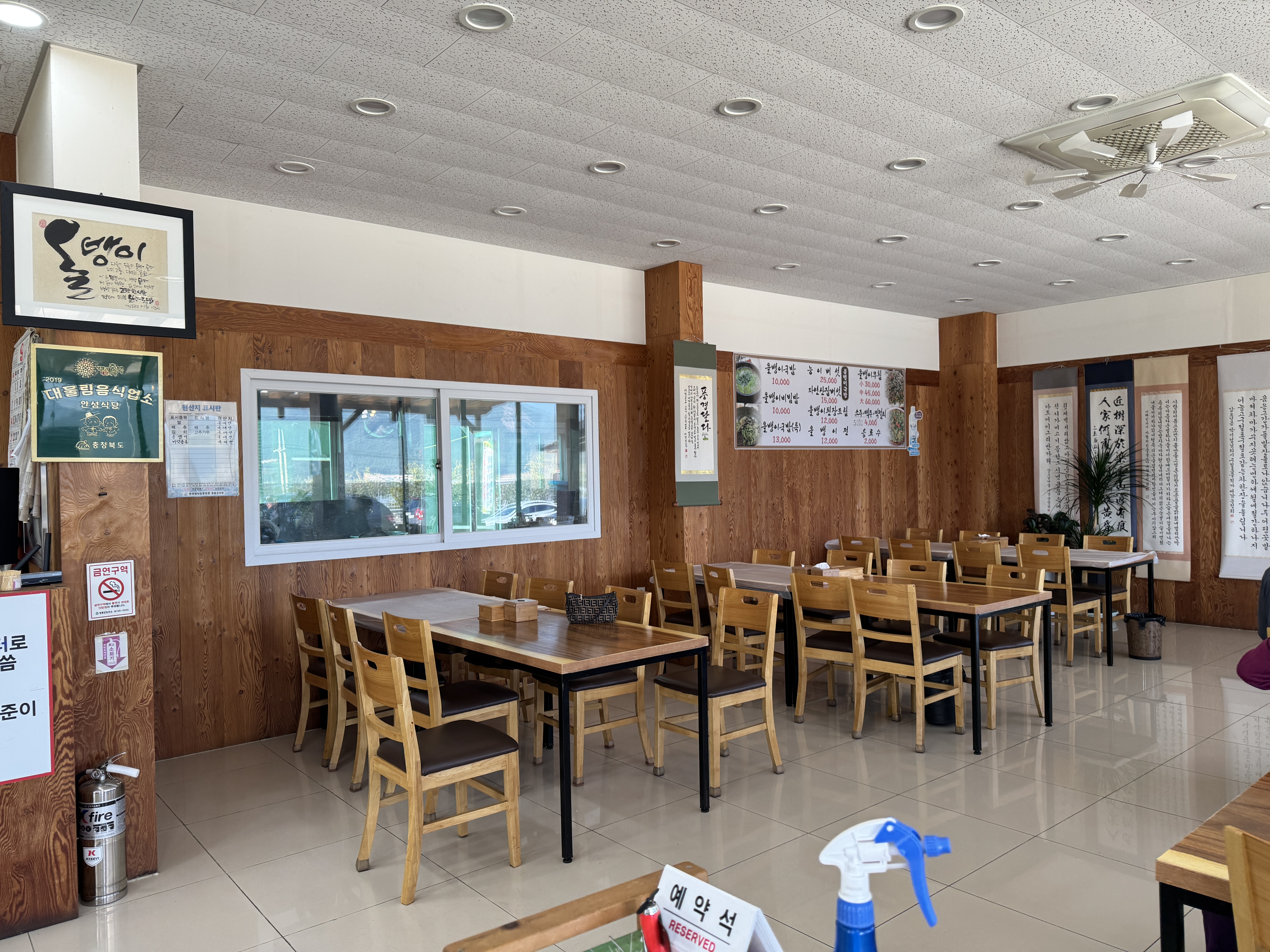 입구 쪽엔 셀프바가 있고, 벽면엔 직접 담은 듯한 전통주 병들이 진열돼 있어 시골 식당 특유의 정감이 느껴지더라고요. 테이블 간 간격도 적당하고, 단체 손님도 받는 규모라 자리가 넉넉해요.